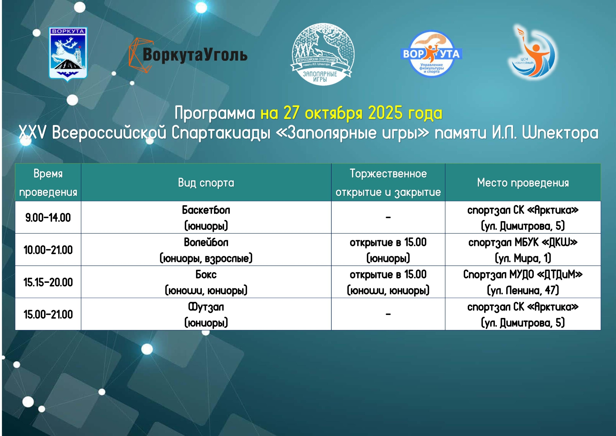 ПРОГРАММА XXV ВСЕРОССИЙСКОЙ СПАРТАКИАДЫ «ЗАПОЛЯРНЫЕ ИГРЫ» ПАМЯТИ И.Л. ШПЕКТОРА НА 27 ОКТЯБРЯ