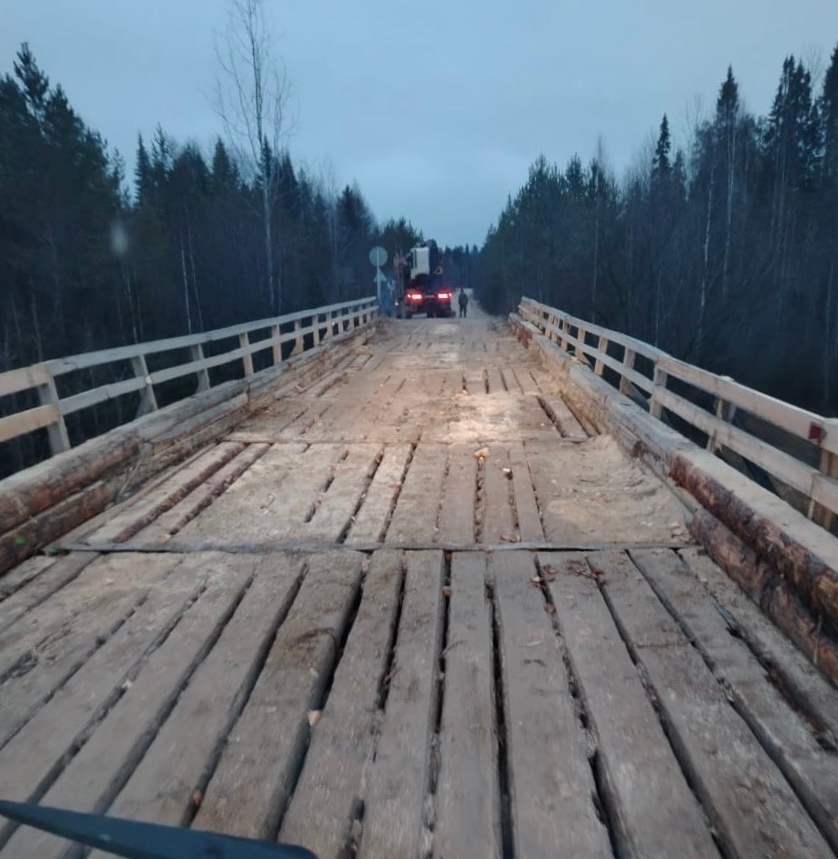 Силами сотрудников ООО «Комиинвестпром» осуществлена замена разрушенных элементов конструкций верхнего настила моста через реку Ын, в...