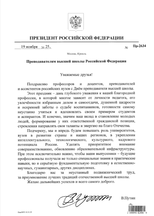 Этот праздник – дань глубокого уважения к вашей благородной профессии, в которой многое зависит от личности педагога, его увлечённости избранным делом и самоотдачи, душевной щедрости и искренней заботы о судьбе воспитанников, готовности самому неустанно учиться и вдохновлять своим примером студентов и аспирантов. И конечно, значим ваш вклад в становление молодых людей, формирование у них ответственной гражданской позиции, стремления направлять свои таланты и энергию на благо Отечества, – говорится, в частности, в поздравительной телеграмме.